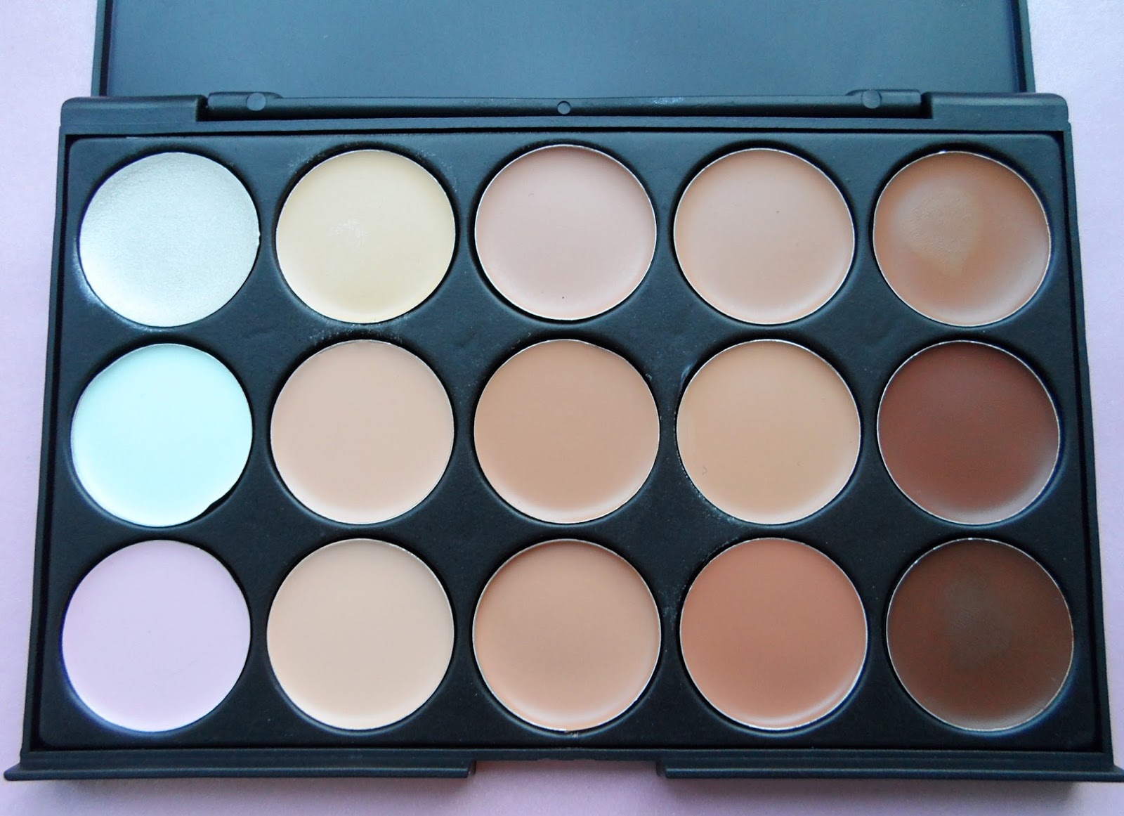 Camouflage Concealer palette includes 15 shades - three very light ivory shades, five caramel and chocolate shade colours. I think everyone could find colour to match their skin. If not - it is easy to mix and create your own shade. Yellow and pink colour hides dark under eye circles and redness. Green concealer is used to hide pink blemishes, pimples, acne and veins. Concealer palette also has a pearly colour, to make the skin look more fresh or to highlight areas. Texture of all concealers is very creamy and kind thick, but it gives a full coverage and doesen`t make my skin dry. One more thing that I like about these concealers, is that they are easily buildable, so you can put layers over and over, without ruining previos layer. It covers even wide pores on my nose:)