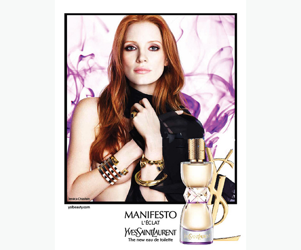 • Jessica Chastain's new YSL beauty campaign is here. In it, Chastain poses topless with nothing more than a strategically-placed scarf around her neck and some very fancy baubles on her wrist. And oh, she's ensconced in some purple smoke we can only assume is the physical manifestation of YSL's Manifesto L'Eclat scent, or something like that. It's very pretty! [