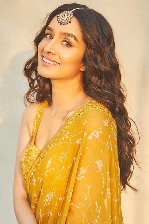 श्रद्धा ने फूलों की प्रिंट और आईने का काम किए हुए किनारे वाली पीली साड़ी पहनी। उन्होंने इसे कढ़ाई वाले ब्लाउज़, मांग-टीका, चूड़ियाँ, और हाइलाइटेड मेकअप के साथ पहना।