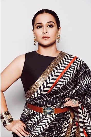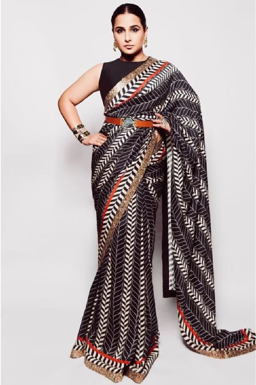 विद्या ने स्वर्ण और लाल किनारे वाली काली और सफेद प्रिंटेड साड़ी में रविशिंग लगीं। उन्होंने इसे सादे ब्लाउज़, कमर पट्टी, बालियां, और स्लीक बन के साथ पहना।