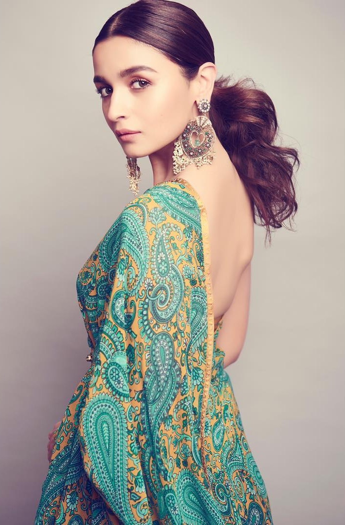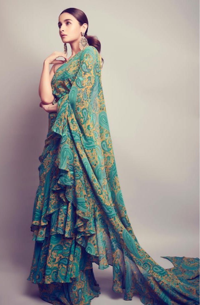 आलिया ने हरी और पीली प्रिंट वाली साड़ी पहनी थी। उन्होंने इसे एक ऑफ-शोल्डर ब्लाउज़, चांदबालीयां, हाइलाइटेड मेकअप, और एक स्लीक पोनीटेल के साथ पहना।