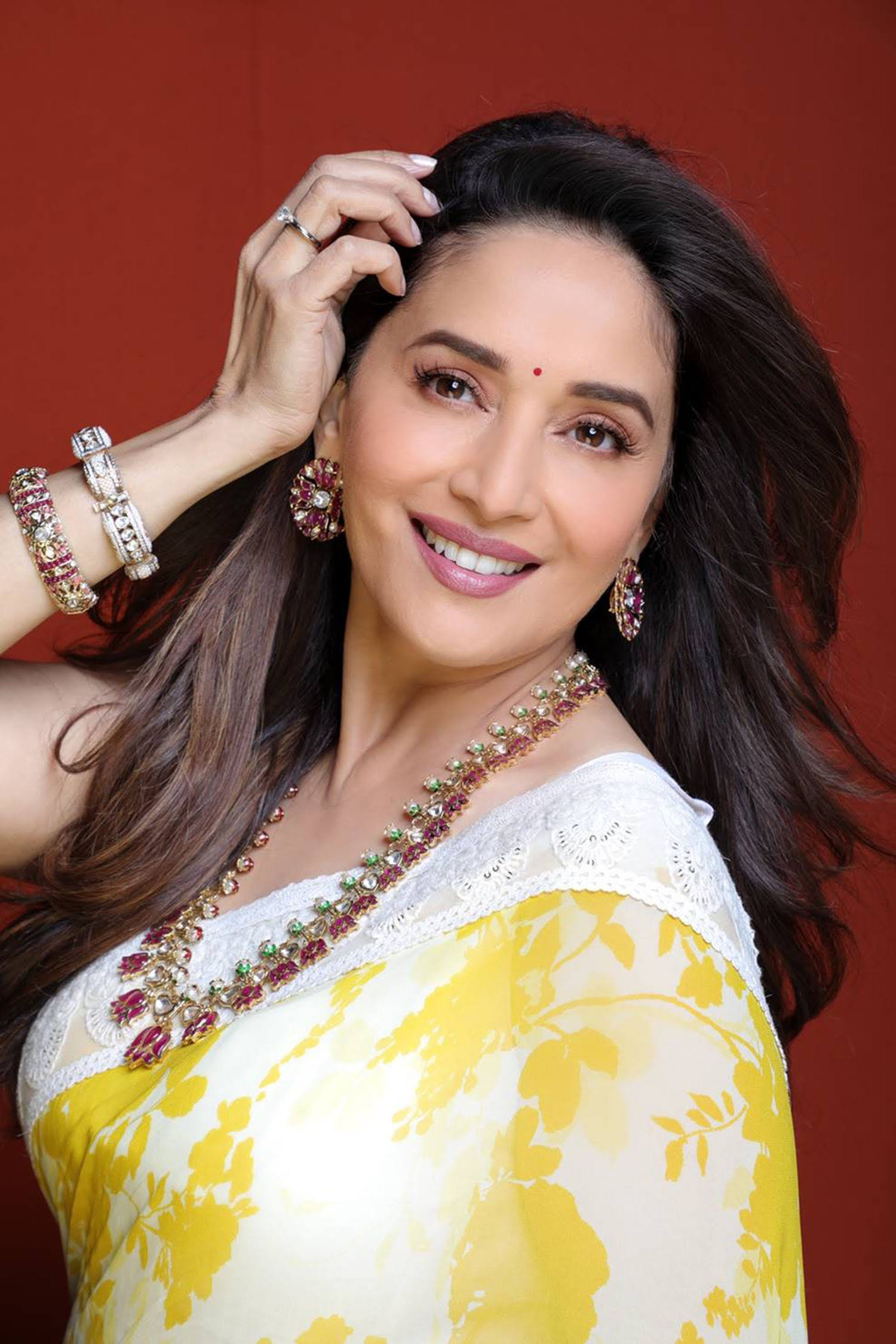 माधुरी एक सफेद और पीली प्रिंटेड साड़ी में सुंदर लग रहीं थीं, जिसके किनारे कढ़ाई से सजे हुए थे। उन्होंने इसे एक सादे ब्लाउज़, मणि और हीरे के हार, और बालियों के साथ मिलाया।