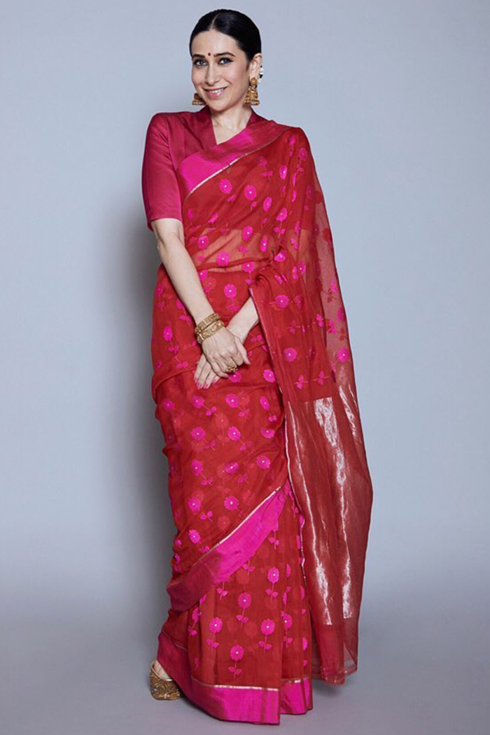 करिश्मा एक लाल साड़ी में मोहक लग रही थीं, जिस पर छोटे गुलाबी फूलों का प्रिंट था। उन्होंने इसे एक गहरे गले के ब्लाउज़, झुमकों, बिंदी, मेकअप, और एक टॉप बन के साथ पहना।
