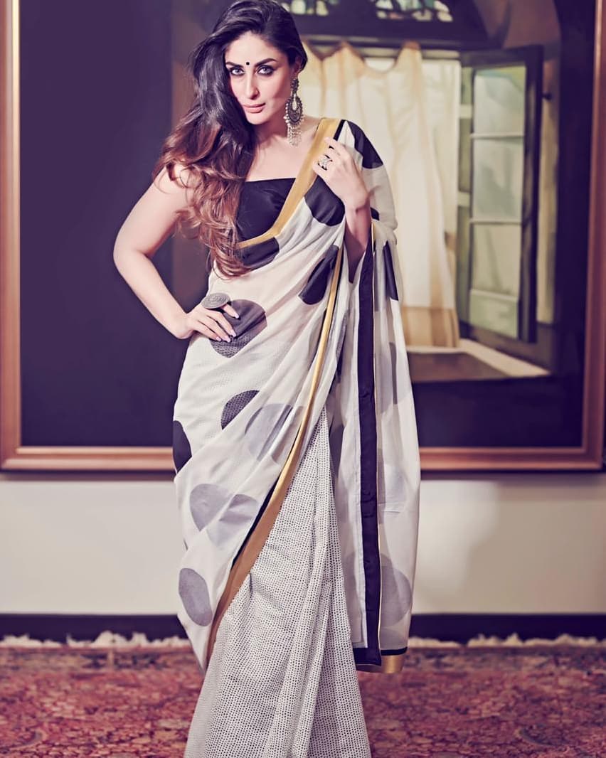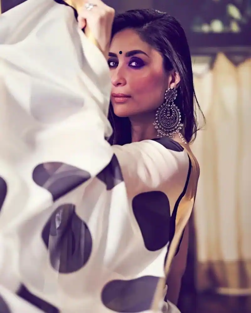 करीना ने कभी एक सफेद और काली प्रिंटेड साड़ी पहनी थी, जिसके किनारे सुनहरे थे। उन्होंने इसे एक काले ब्लाउज़, ऑक्सीडाइज्ड बालियां, बिंदी, स्मोकी आँखों, और न्यूड लिपस्टिक के साथ पहना।