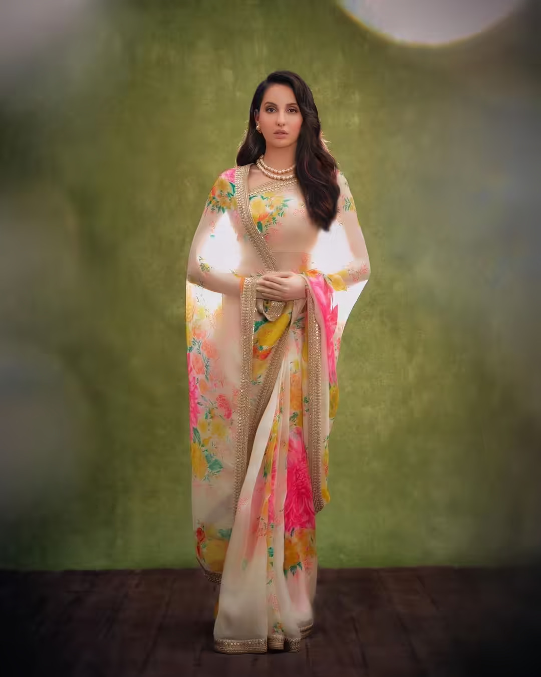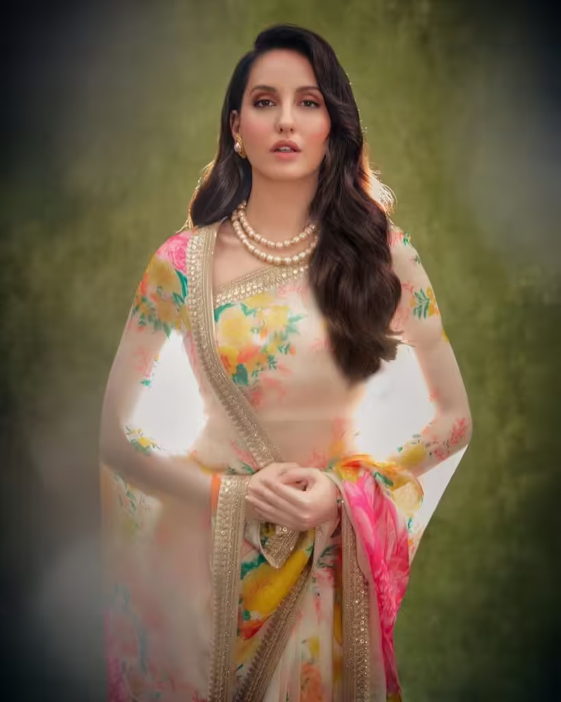 नोरा फूलों की प्रिंट और स्लीक किनारों वाली सफेद साड़ी में खूबसूरत लग रहीं थीं। उन्होंने इसे सादे ब्लाउज़, मोती की माला, स्टड बालियां, मिनिमल मेकअप और खुले बालों के साथ पहना।