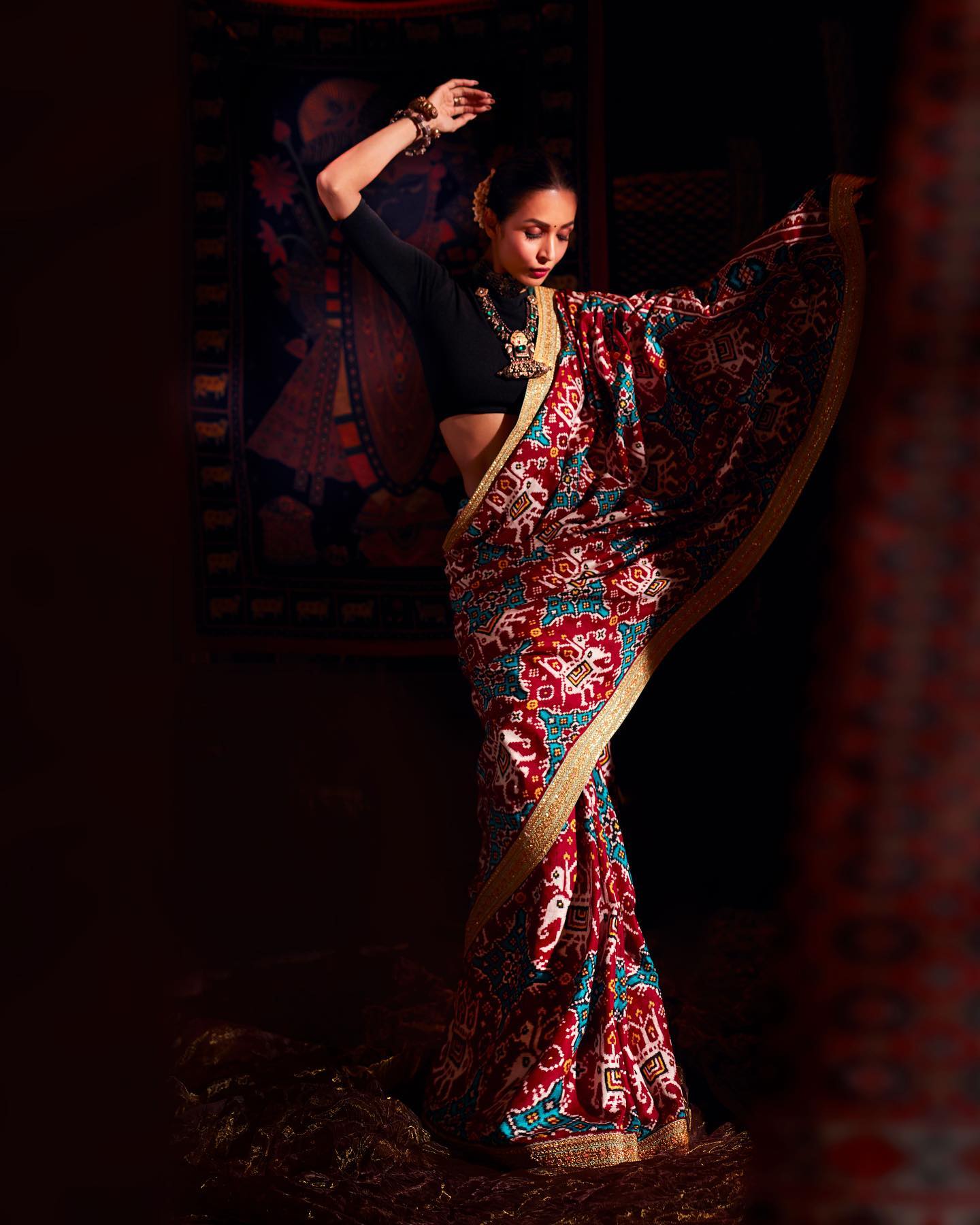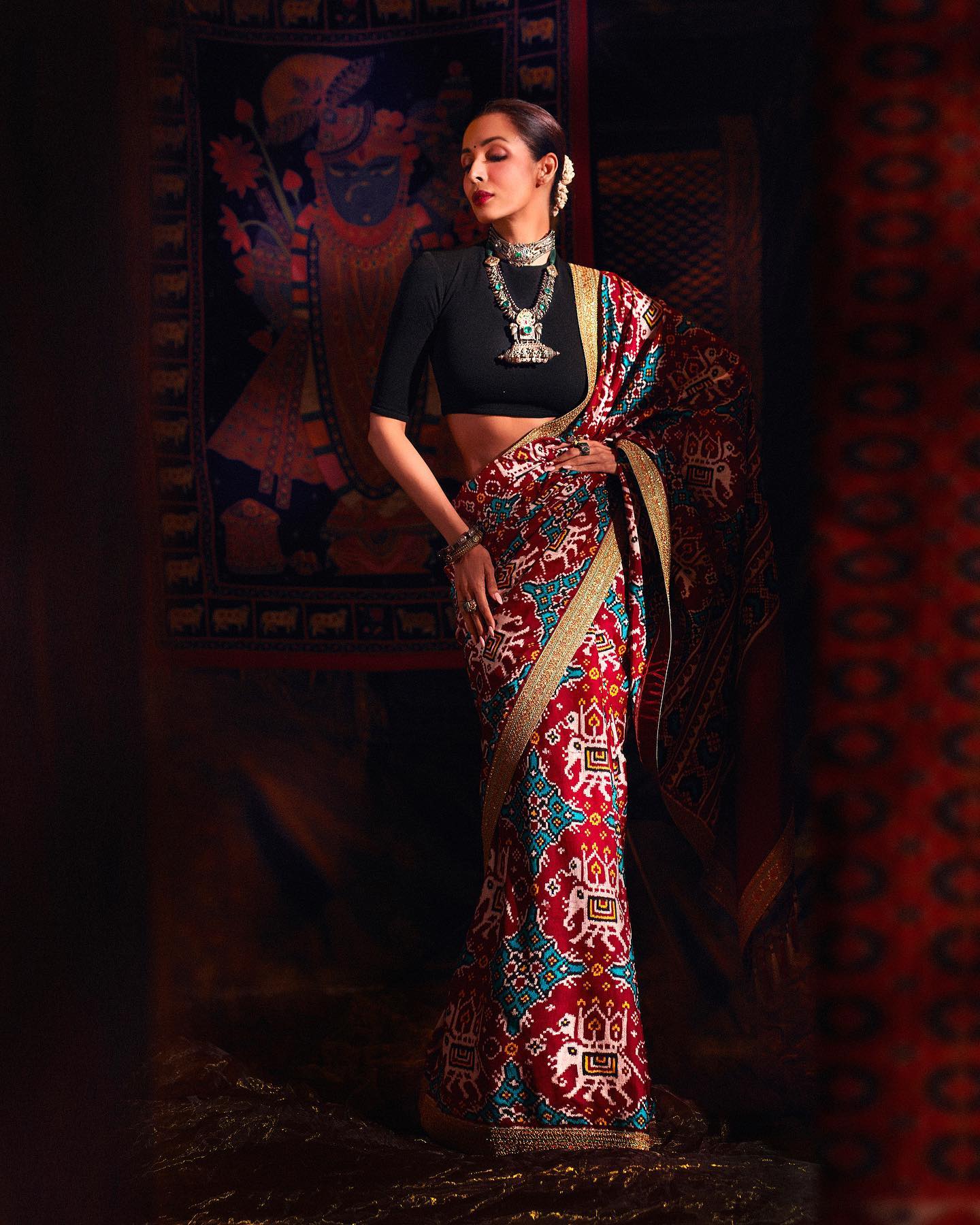 मलाइका ने सुनहरे किनारे वाली लाल साड़ी पहनी। उन्होंने इसे काले ब्लाउज़, परतदार ऑक्सीडाइज्ड हार और ग्लैमरस मेकअप के साथ पहना।