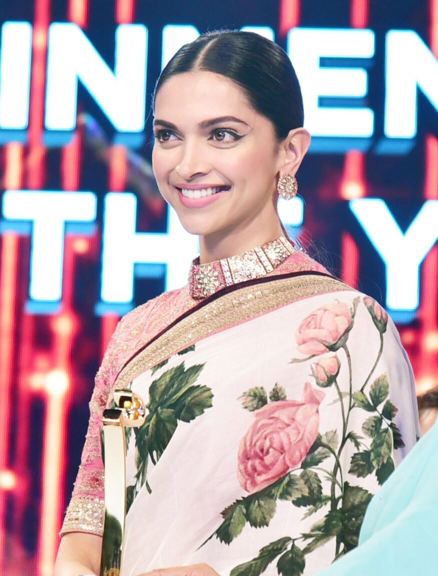 दीपिका ने गुलाबी प्रिंट वाली सफेद साड़ी में सुंदरता का आभास किया। उन्होंने इसे गुलाबी कढ़ाई वाले ब्लाउज़, स्टड बालियां, मेकअप, और एक स्लीक बन के साथ पहना।