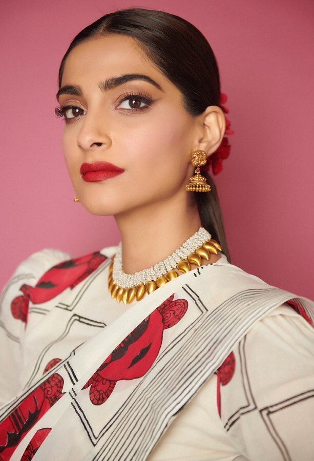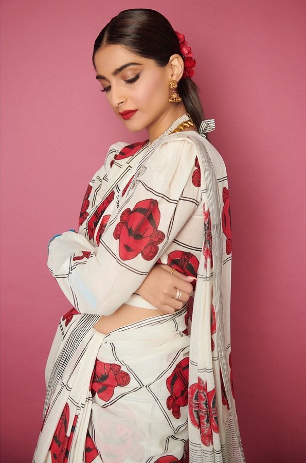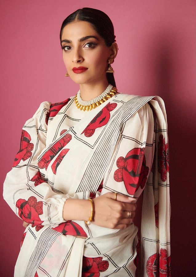 सोनम ने अद्वितीय प्रिंट वाली सफेद चेकर्ड साड़ी में शैली का वक्तव्य बनाया। उन्होंने इसे आस्तीन वाले ब्लाउज़, सोने के गहने, लाल होंठ, और स्लीक बालों के साथ पहना।