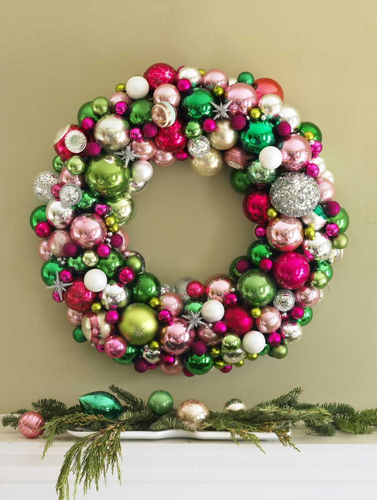 Come utilizzare tutte le palline che vi sono avanzate dall’albero di Natale? Semplice! Con una ghirlanda di sole palline colorate. Vi occorrerà una semplice gruccia in ferro, apritela da un lato, il più vicino possibile al gancio, rimodellatela affinché prenda la forma di un cerchio e riempitela di palline colorate, di varie dimensioni e colori. L’effetto wow! è assicurato e sarà tutto a costo zero e con zero stress.
