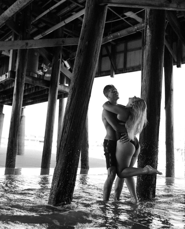 Enquanto Marina usa um biquíni preto, Felipe usa uma bermuda da mesma cor. Durante o ensaio, ela tirou algumas fotos com um short jeans branco sobre o biquini e ele com uma camiseta regata cinza. Além das fotos à beira mar, Marina posou abraçadinha com o namorado debaixo de um dos píers mais conhecidos do litoral estadunidense.