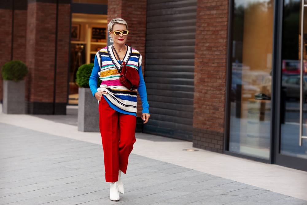 Não estamos falando de regras aqui: vista o que você quiser vestir e o que você se sentir confortável vestindo! Porém, uma peça que recomendamos para as mulheres com mais de 40 anos são as calças, principalmente as mais leves e folgadas. Com elas, você consegue uma aparência mais elegante, mesmo em uma situação casual. Para fortalecer ainda mais esse efeito, ajuste a barra da calça, e a combine com um calçado elegante, como um saltinho baixo, ou mais despojado, como um tênis.