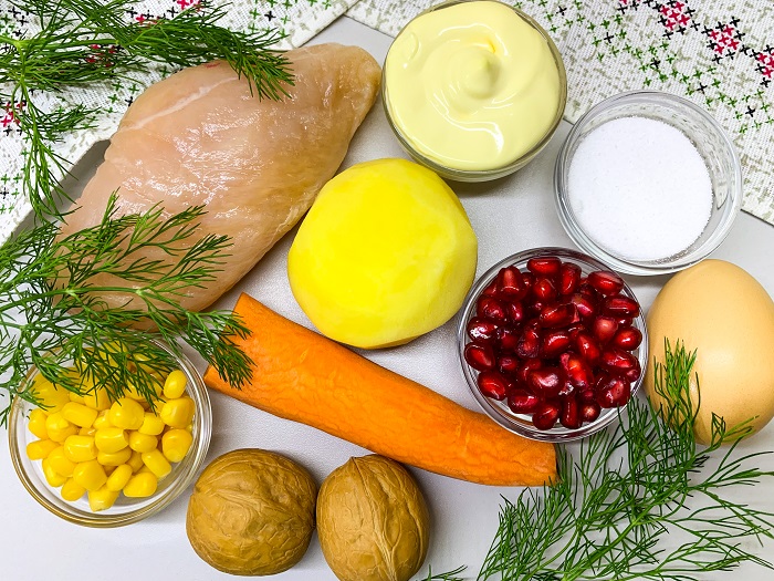 Для приготовления салата вам потребуется мясо (мы возьмем куриное филе), яйца, картофель, морковь, кукуруза, грецкие орехи и гранат. Салат слоеный, для заправки используйте майонез.
