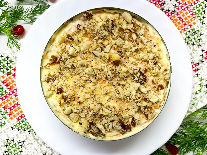 Второй слой — кубики курицы. Затем слой яиц. Четвертый — мелко натертая отварная морковь. Измельчаем в ступке или ножом грецкие орехи и посыпаем завершающим штрихом. Не забудьте присолить и смазывать майонезом каждый слой блюда.