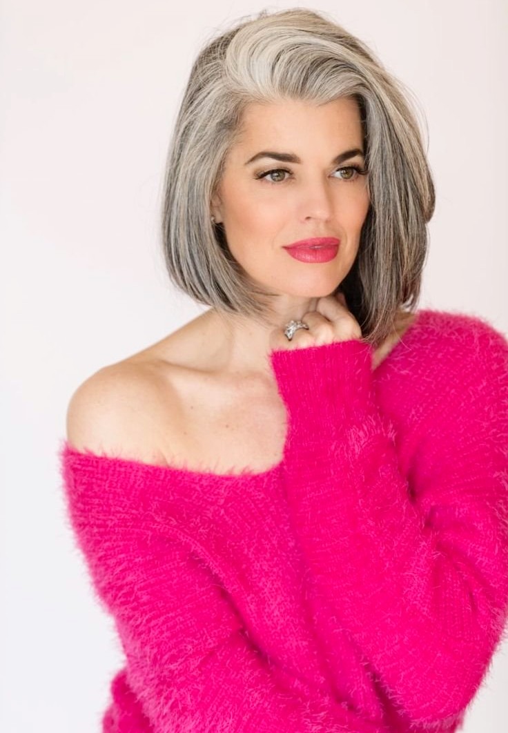 Не каждой женщине по вкусу густая шевелюра из седых волос. Но при этом далеко не все решаются сделать короткую стрижку вроде пикси или боб. Выход прост: оставить длину до плеч и акцентировать внимание на текстуре и слоях. Такой вариант выглядит максимально выигрышно и свежо на седых волосах.