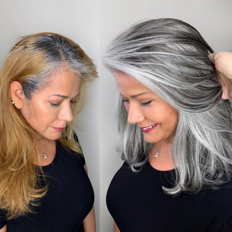 Если вы решили отдать предпочтение натуральности, то постепенное отращивание седины может изрядно утомить. Тем более, что нам женщинам хочется всегда выглядеть ухоженно. В такой ситуации сделайте сложное окрашивание, при котором седые волосы мягко смешиваются с затемненными прядями. Вас больше не будет раздражать грубый переход цвета по линии роста волос, а на корректировку цвета и уход будет уходить гораздо меньше времени.