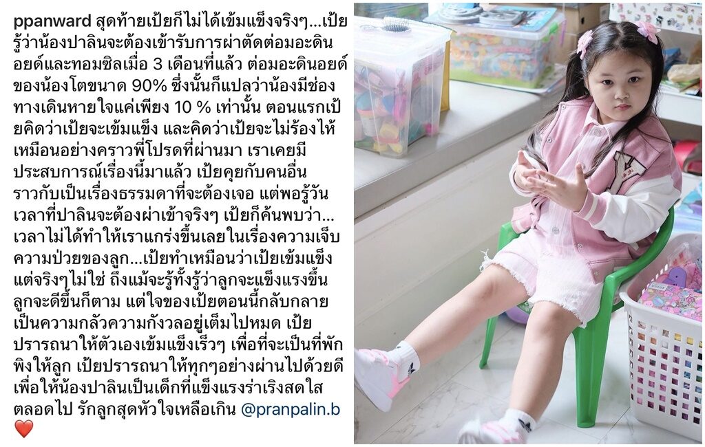 เรื่องการฟื้นตัวหลังผ่าตัด เธอบอกว่า แล้วแต่ตัวอาการของเด็ก บางคนใช้เวลา 2-3 วัน ตอนโปรดก็อาทิตย์ ขณะที่ครั้งนี้ก็หวังว่าปาลินเวลาฟื้นตัวไม่นาน
