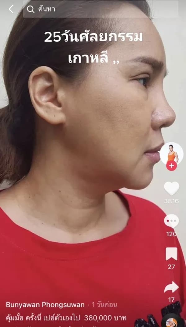 โดย ส้มเช้ง สามช่า นำเอาภาพถ่ายตั้งแต่ก่อนทำศัลยกรรม หลังศัลยกรรม ไปจนถึงใบหน้าเวอร์ชั่นปัจจุบันที่ผ่านการพักฟื้นร่วมเดือนให้เห็นถึงความเปลี่ยนแปลงและความแตกต่าง พร้อมกับแนบแคปชั่นระบุราคาค่าใช้จ่ายทั้งหมดว่า “คุ้มมั้ย ครั้งนี้ เปย์ตัวเองไป 380,000 บาท”